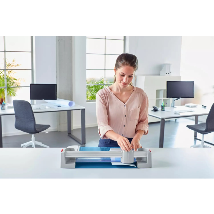Profesionálna rezačka so stabilnou kovovou základňou s protišmykovými gumenými nožičkami pre bezpečné udržanie rotačného rezača na mieste a presným rezom na grafické účely (filmy, fólie, papier). Kvalita na dosiahnutie najvyššej presnosti - automatický prítlak pohybom rezacej hlavy, nastaviteľný zadný doraz s použitím na oba boky, množstvo zakreslených orientačných DIN formátov. Kruhový nôž umiestnený v plastovom ochrannom kryte sa automaticky brúsi pri rezaní o protinôž (oba nože z tvrdenej ocele). Mierka v cm/inch. Možnosť montáže na stenu.