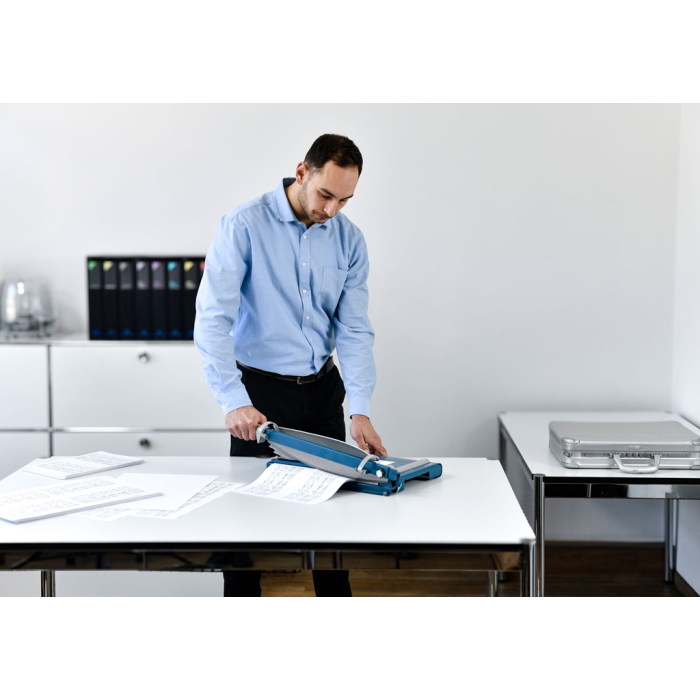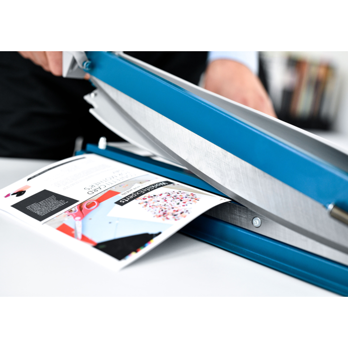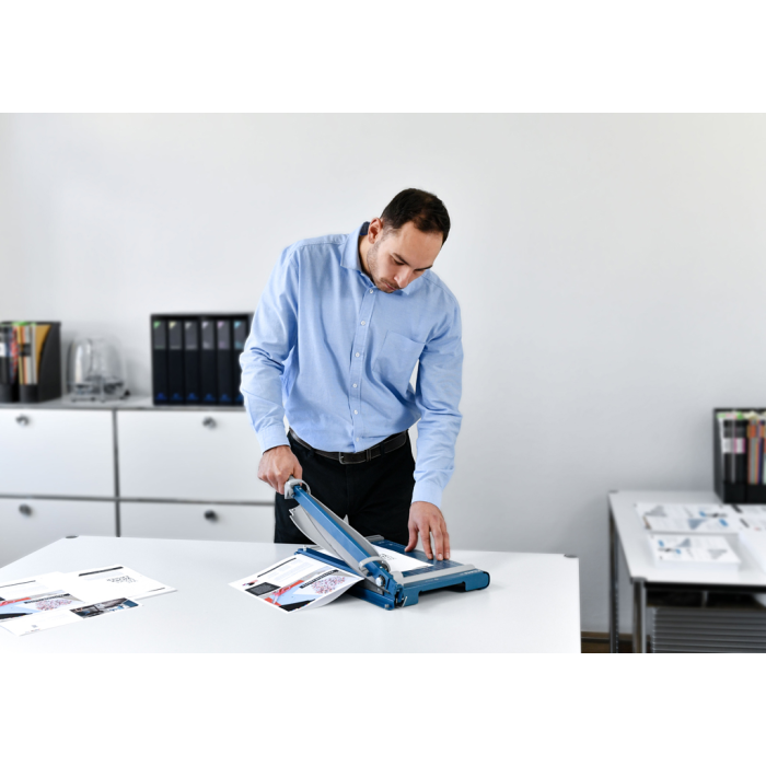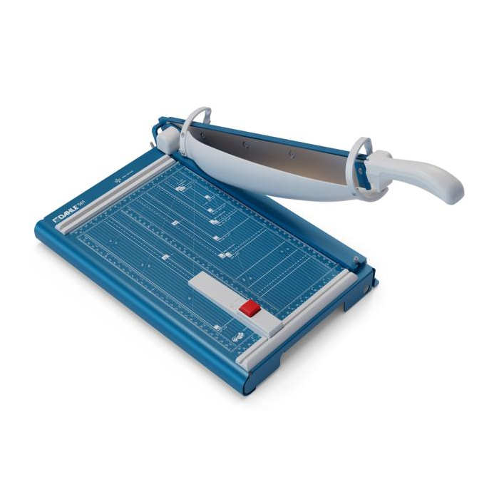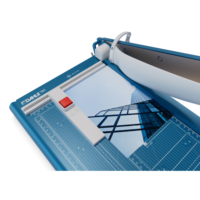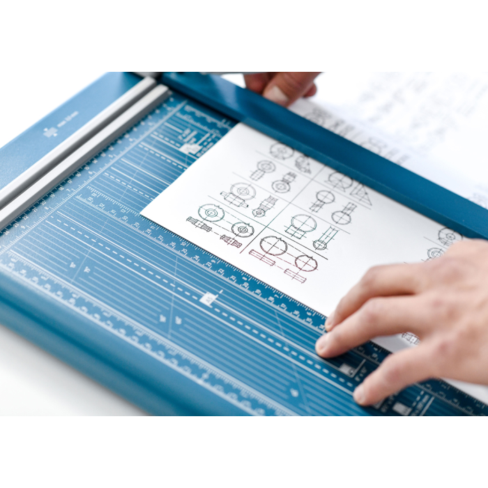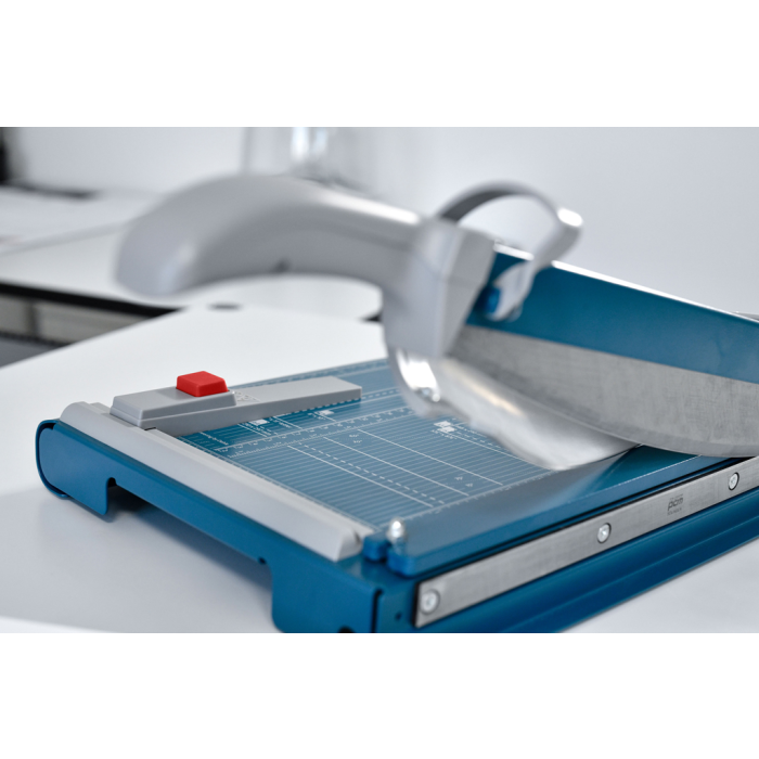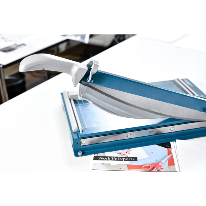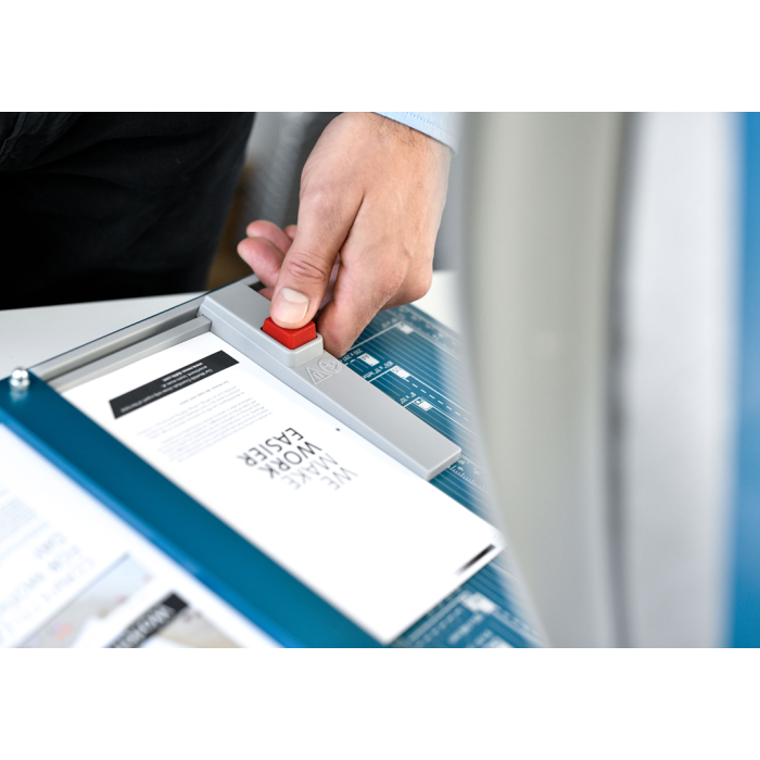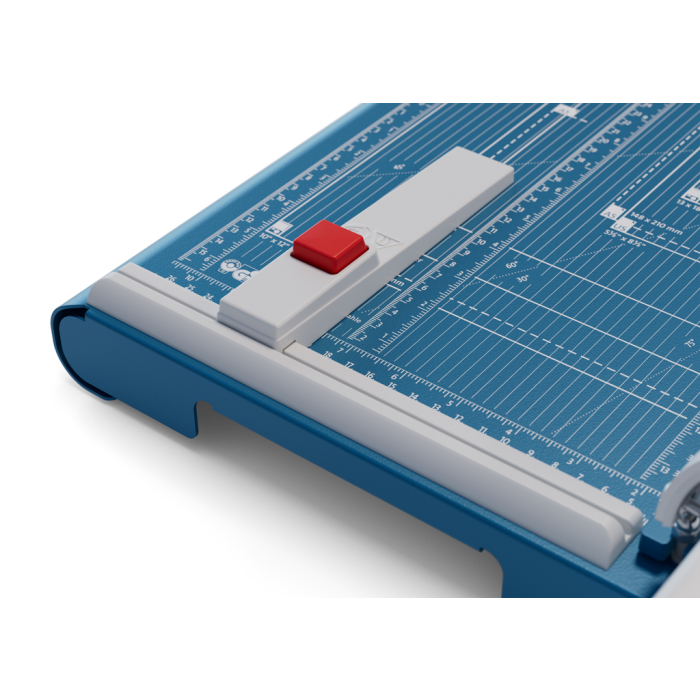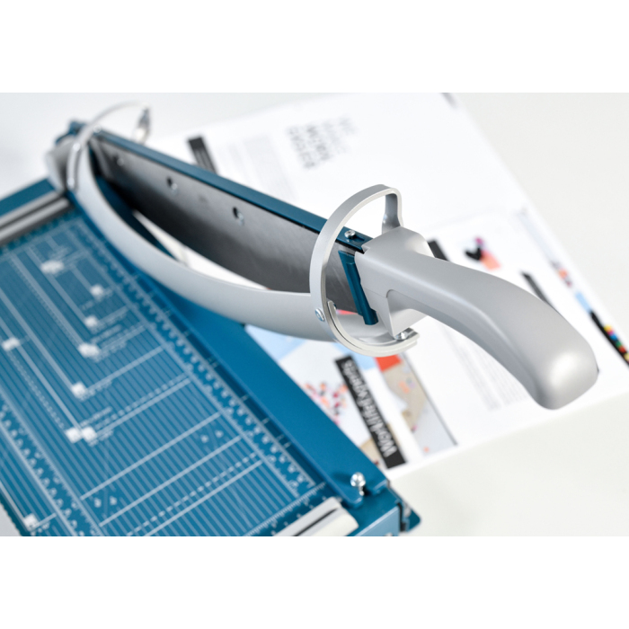 Páková rezačka z pevného oceľového plechu. Základný vrchný a základný spodný brúsený nôž vyrobený z kvalitnej nožiarskej ocele Solingen. Rotujúci kryt okolo ostria chráni prsty pred náhodným porezaním. Presná mierka v cm/inch a DIN formátoch. Automatický prítlak. Model s výrezmi na pohodlné prenášanie.