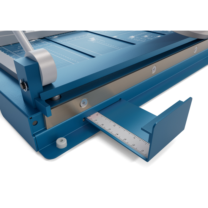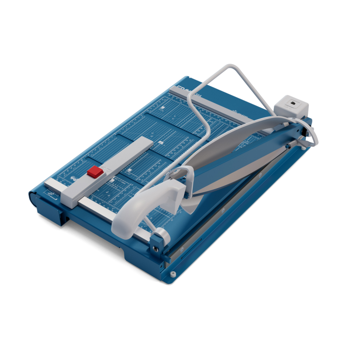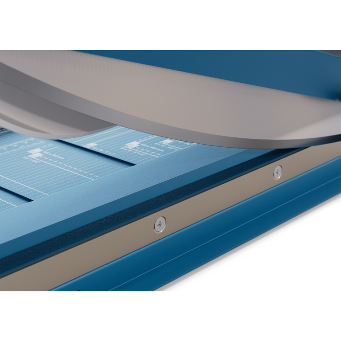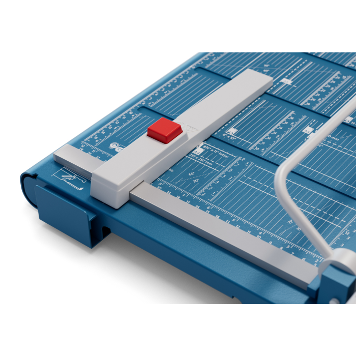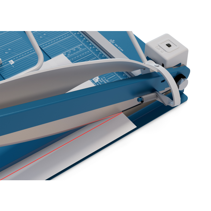 Protišmyková, pohodlná a presná páková rezačka s kovovou základňou na rezanie papiera, kartónu, kože, plastu. Inovovaná technológia s laserovým lúčom, indikujúcim reznú líniu. Brúsený vrchný a spodný nôž z kvalitnej nožiarskej ocele Solingen, rotujúci kryt okolo ostria. Stabilný stôl z masívneho kovu so zaoblenými hranami a protišmykovými gumenými nožičkami pre pevné postavenie. Formátovacie čiary na stole pre lepšie zarovnanie materiálov s praktickou mm stupnicou pozdĺž reznej hrany. Presná mierka v cm/inch a DIN formátoch. Výrez na spodnej časti na pohodlné prenášanie. Presný indikátor laserového lúča pre profesionálne výsledky rezania.