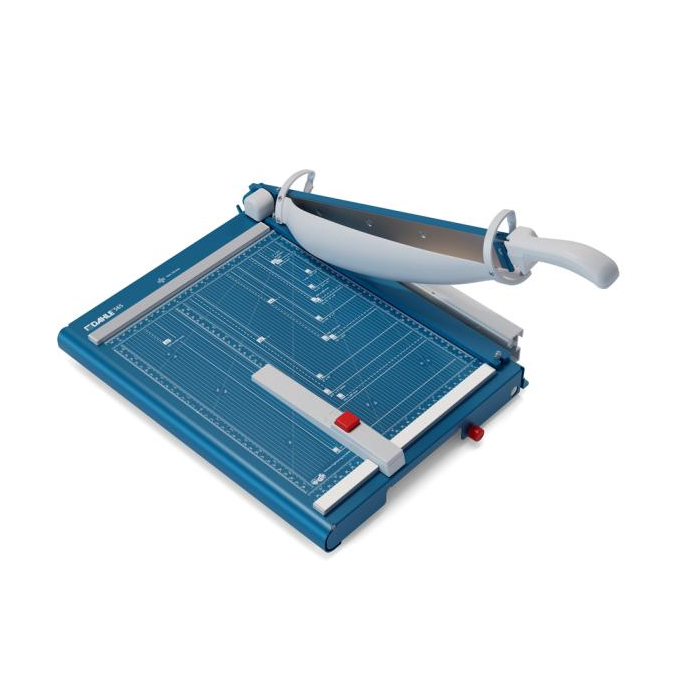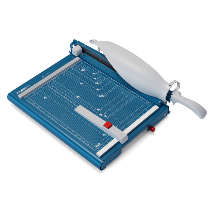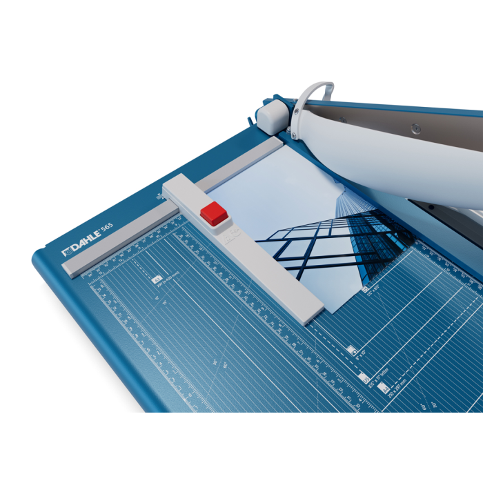 Veľkorozmerná, protišmyková a presná páková rezačka z pevného oceľového plechu. Základný vrchný a základný spodný brúsený nôž vyrobený z kvalitnej nožiarskej ocele Solingen. Rotujúci kryt okolo ostria chráni prsty pred náhodným porezaním. Presná mierka v cm/inch a DIN formátoch. Automatický prítlak. Model s výrezmi na pohodlné prenášanie, navyše vybavený predným dorazom, vysúvateľným do 170/185 mm. Pohodlná práca vďaka ergonomickej rukoväti optimalizovanej pre prenos sily zhora. Unikátny automatický ochranný kryt Dahle pre jasný výhľad na reznú hranu.