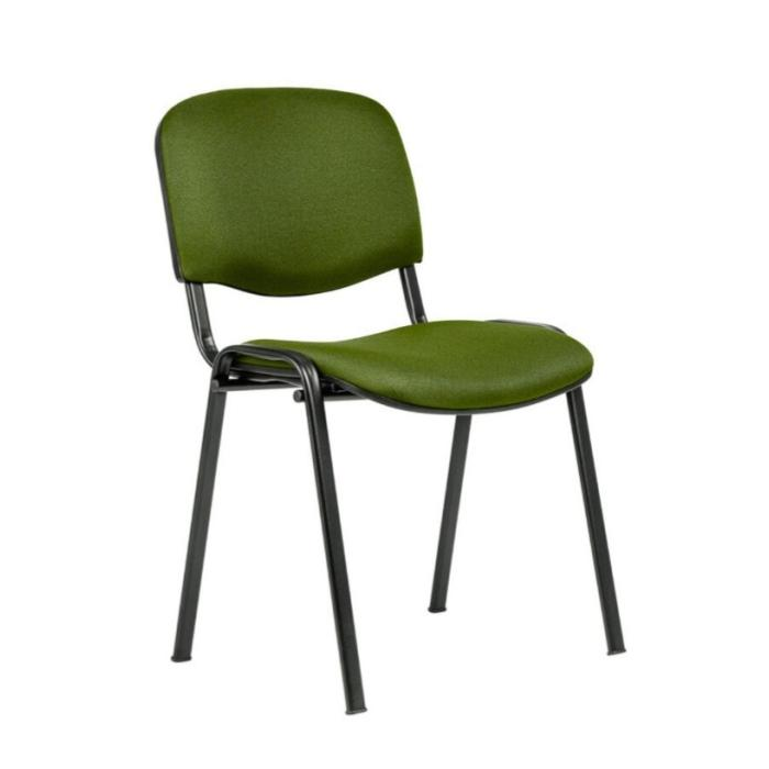 Stohovateľná konferenčná stolička s látkovým poťahom, sedadlo so spodním plastovým krytom.