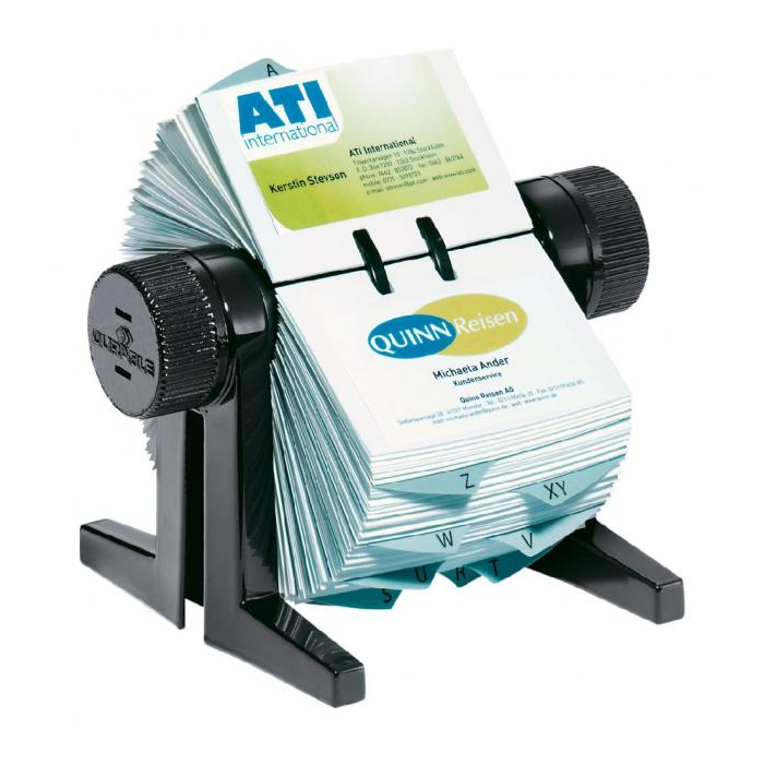 Praktický rotačný vizitkár s rozraďovačom. Vyrobený z kvalitného plastu. Obsahuje 150 obojstranných vreciek rozmeru 72 × 104 mm a abecedný rozraďovač s 25 oddielmi. Kapacita 300 vizitiek. Vrecká na vizitky sa ľahko vyberajú a umožňujú tak rýchle narábanie s vizitkami. Farba: čierna Rozmery 215x120x185 mm