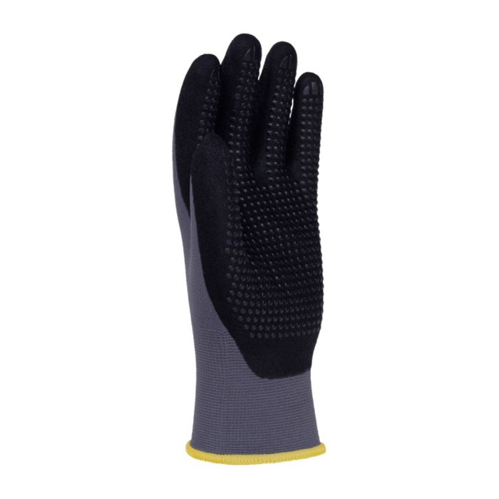 Vysokokvalitné ochranné rukavice vyrobené z odolnej pleteniny z nylonu s prídavkom elastanu v sivej farbe. Úchopová časť dlane je potiahnutá ultra jemnou penou z nitrilu, doplnenou čiernym bodkovaním pre zlepšenie priľnavosti. Rukavice sú určené na široké spektrum činností vrátane montáže, skladovania, mechanických prác, servisu, dopravy, stavebných a opravárenských prác atď. Rukavice umožňujú presnú manipuláciu a spoľahlivý úchop, čo z nich robí ideálnu voľbu pre detailné montážne práce. Bodkovaný povrch v úchopovej zóne ďalej zvyšuje priľnavosť. Zároveň poskytujú zvýšenú odolnosť voči olejom a mazivám.