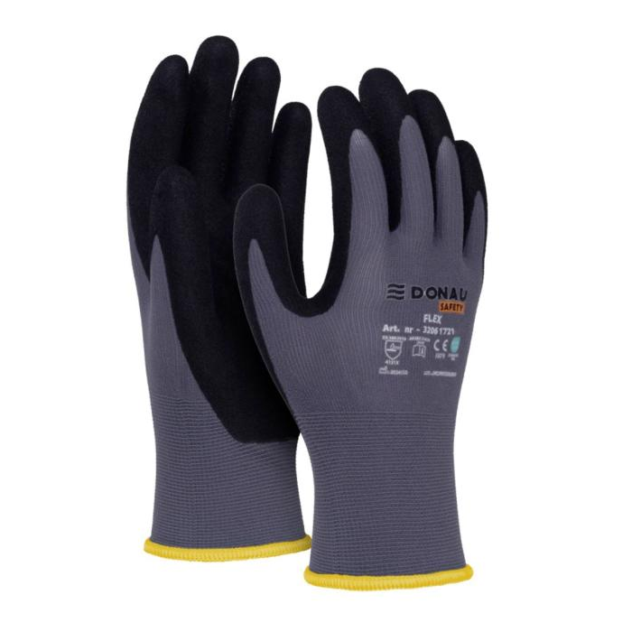 rukavice z kvalitnej pletenej nylonovej tkaniny s elastanom v šedej farbe, v úchopovej časti potiahnuté ultra jemnou nitrilovou penou čiernej farby