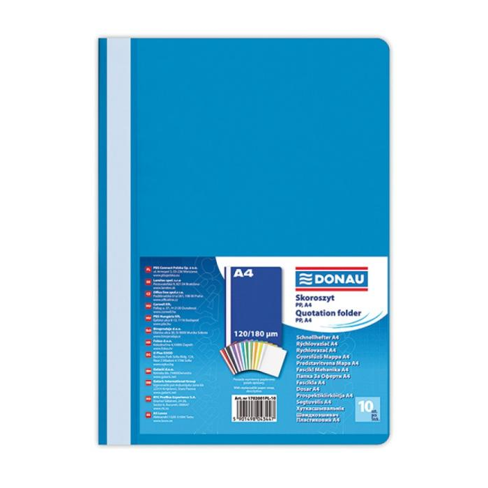 Štandardný polypropylénový rýchloviazač s priehľadnou prednou stranou a nasúvacím popisným pásikom. Formát A4. Balenie 10 ks.
