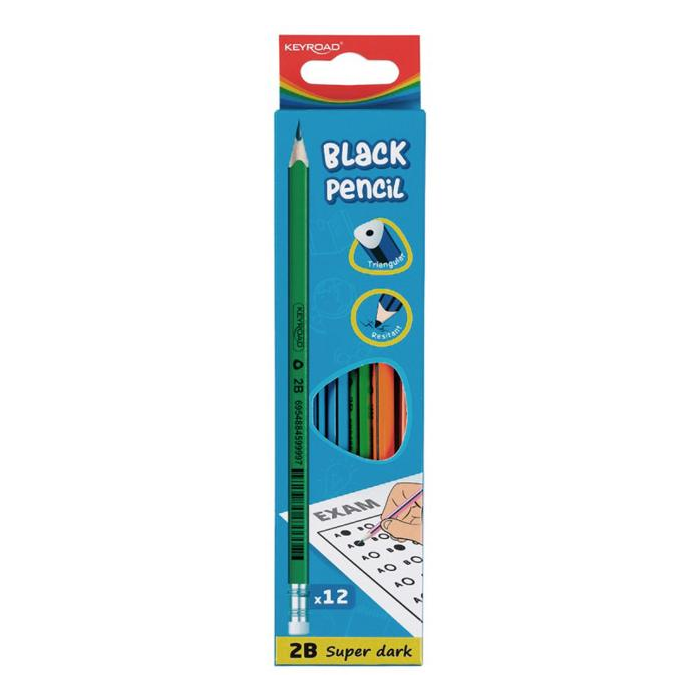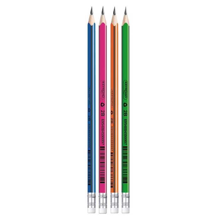 Ceruzka vyrobená z dreva, s gumou, trojuholníkové telo. Tvrdosť: 2B. farba: mix farieb.
