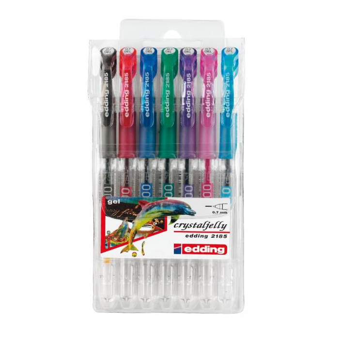 Jednorazový roller edding 2185 crystaljelly plnený špeciálnym gélom. Hrot pera uložený v akrylovej špičke umožňuje plynulé a súčasne veľmi presné písanie. Šírka stopy 0,7 mm. Sada 7 štandardných farieb.