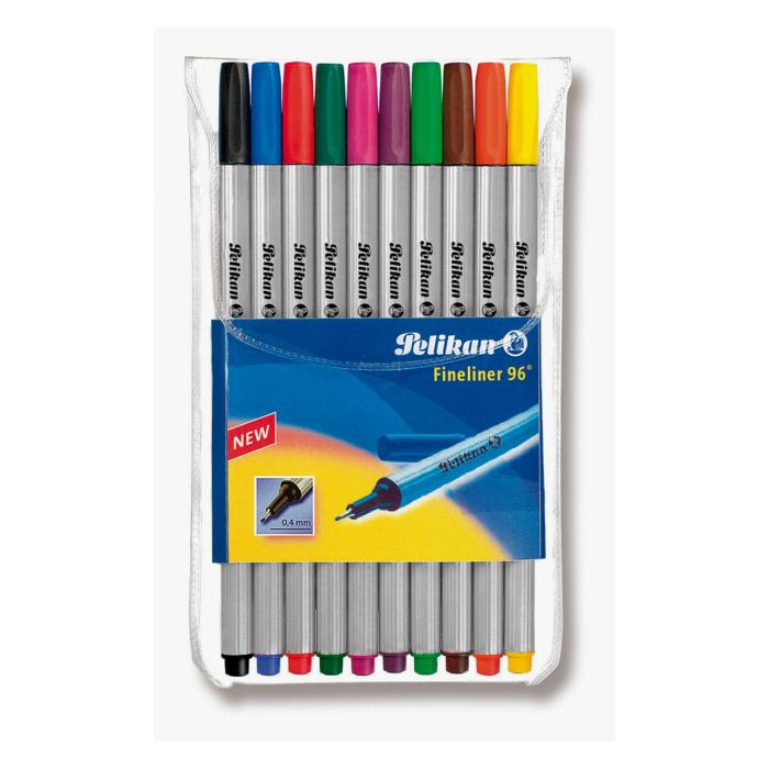 Jednorazový liner Pelikan Fineliner 96 - 10ks, priemer hrotu 0,4 mm. Vhodný pre presné písanie, kreslenie, rysovanie podľa šablóny alebo pravítka. Balenie v plastovom obale, 10 farieb.