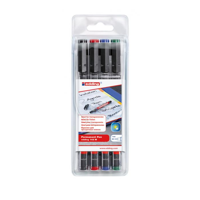 Popisovač na popisovanie fólií na spätnú projekciu. Hrot okrúhly, šírka stopy 1 mm. Sada 4 farieb.