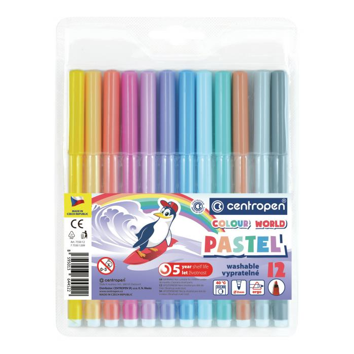 Vyprateľné farebné pastelové popisovače s ERGO držaním odolávajú vyschnutiu až 5 rokov. Zdraviu neškodlivý atrament, ventilačný vrchnák valcový hrot odolný voči zatlačeniu, šírka stopy 1 mm. Sada 12 popisovačov.