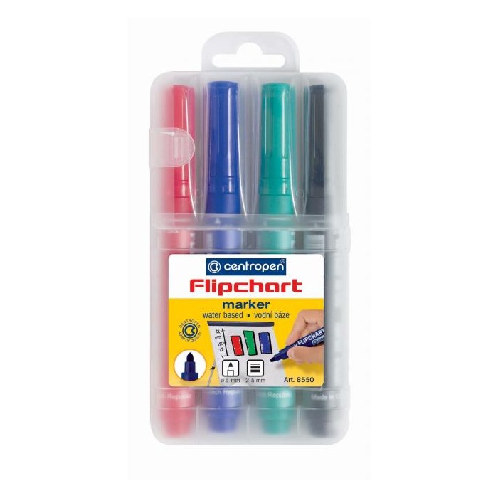 Popisovač s nezapáchajúcim atramentom na vodnej báze určený na flipchartové papiere. Hrot okrúhly, šírka stopy 2,5 mm. Dodávaný samostatne alebo v 4 ks sade. Väčšie balenie 10 ks v jednej farbe. Farba: mix 4 farieb Šírka stopy: 2,5 mm Typ hrotu: okrúhly