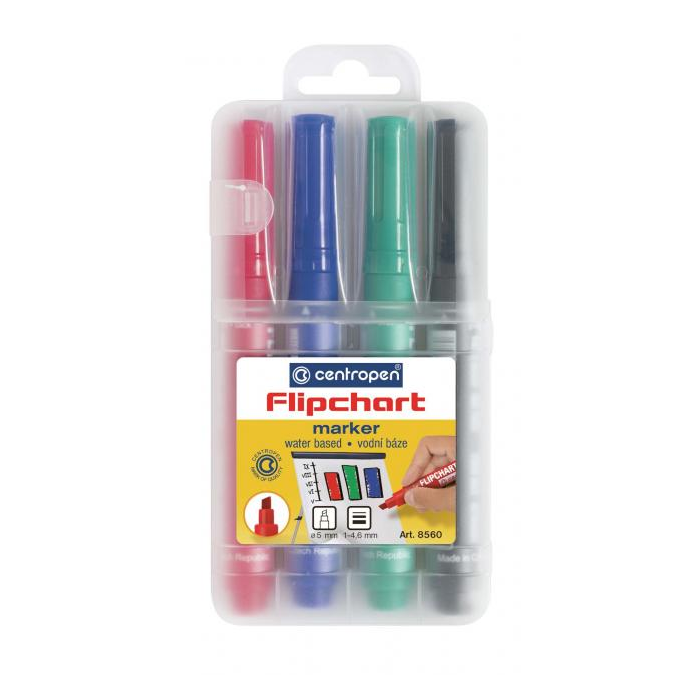 Popisovače s atramentom na vodnej báze určené na flipchartové papiere. Funkčnosť otvorených popisovačov je jeden týždeň. Väčšie balenie 10 ks. Hrot zrezaný, šírka stopy 1 - 4,6 mm. 4 farebný mix.