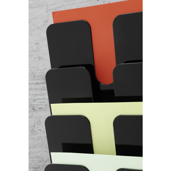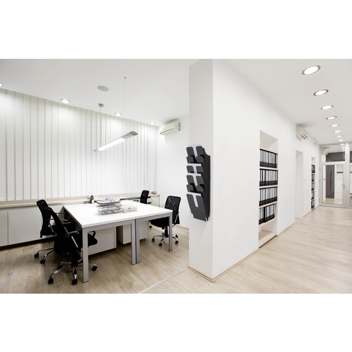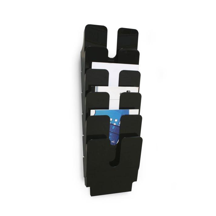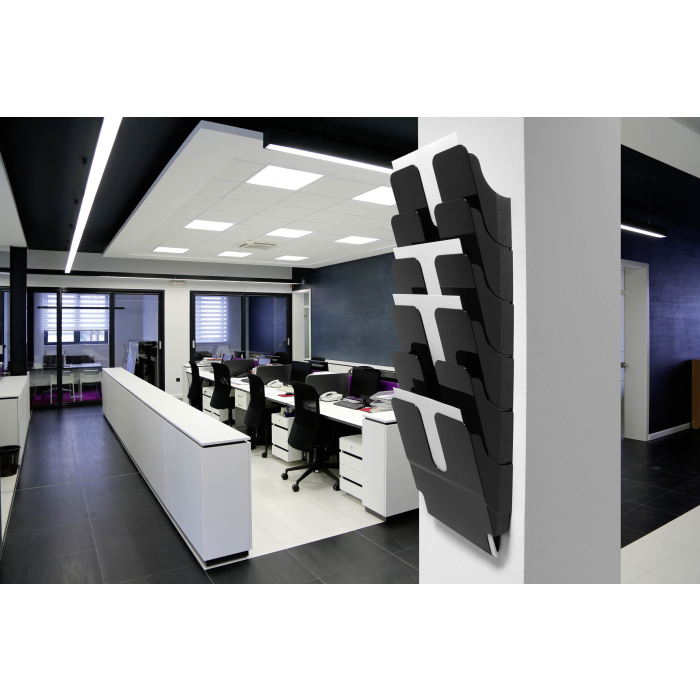 Sada stojanov na brožúry Flexiplus so 6 priehradkami na informácie vo formáte A4. Priehradka s kapacitou 23 mm. Montáž sady na stenu. Rozmery: 247 x 1080 x 100 mm (Š x V x H). Ideálna na vystavenie letákov, novín a časopisov v recepciách a čakárňach, na veľtrhoch alebo v kancelárii. Vyrobené v Nemecku. Farba čierna.