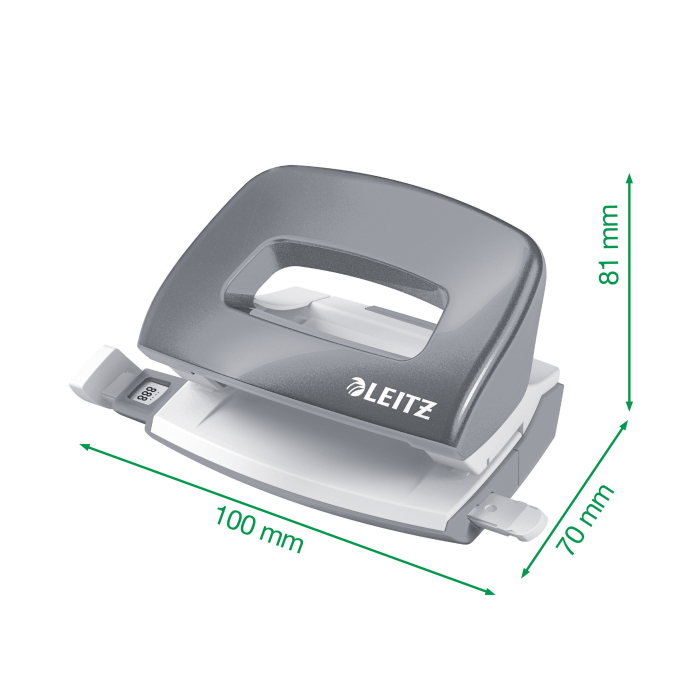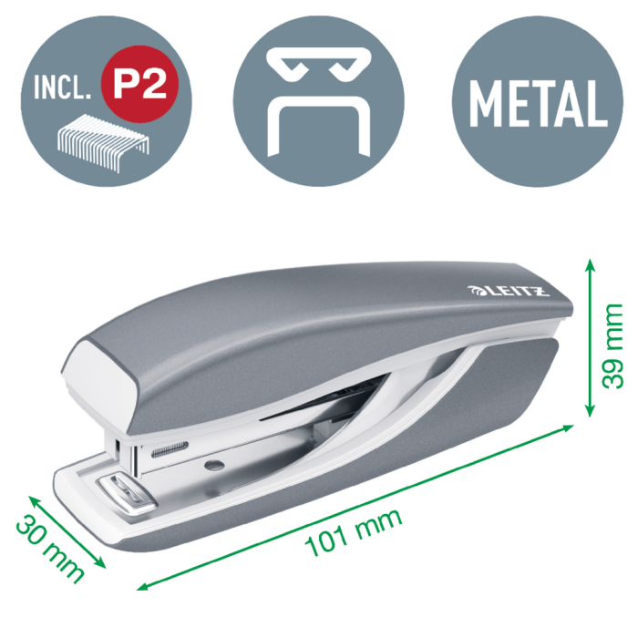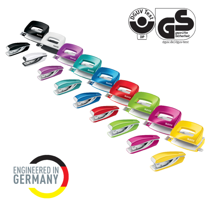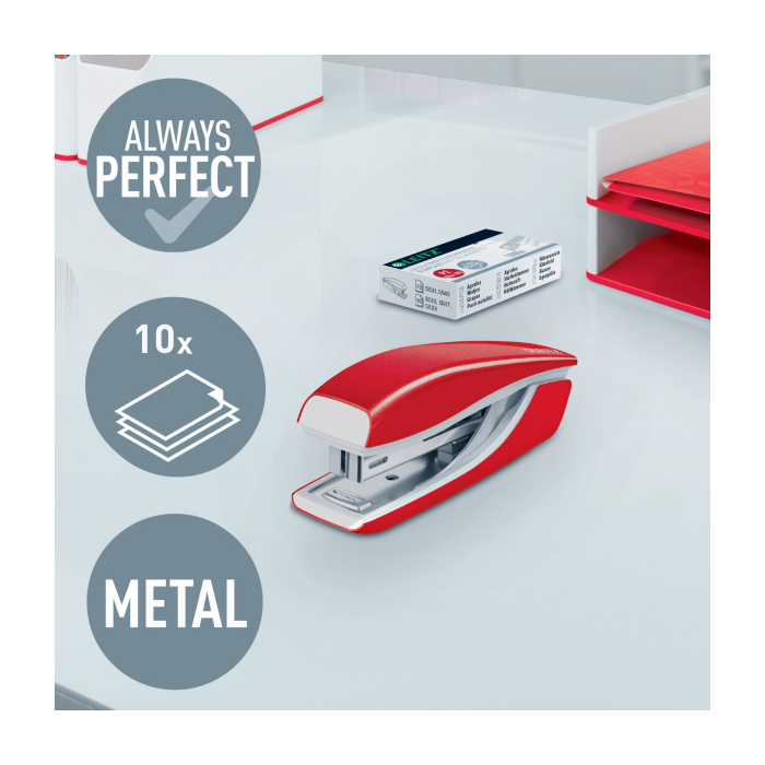 Minisúprava v moderných farbách. Malé a kompaktné rozmery. Kapacita 10 hárkov. Celokovová minizošívačka a dierovačka na použitie v kancelárii aj na cestách. Zošívačka s otvorením ramena o 180° na nástenkové zošívanie. Použite spinky Leitz Power Performance P2, č. 10, jedna škatuľka spiniek je súčasťou balenia. Dierovačka má príložník s kontrastnou potlačou jednotlivých formátov, rámček na jasné určenie formátu. Balenie v blistri. Farba červená.
