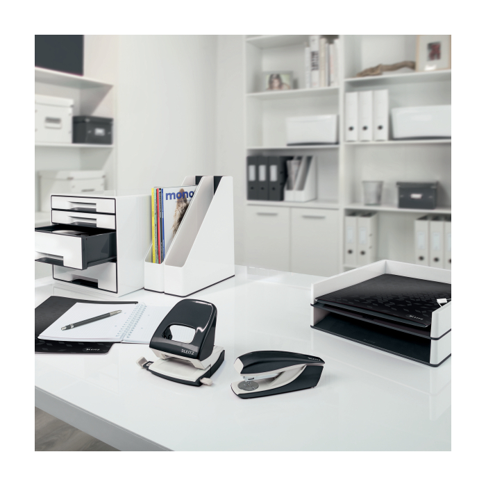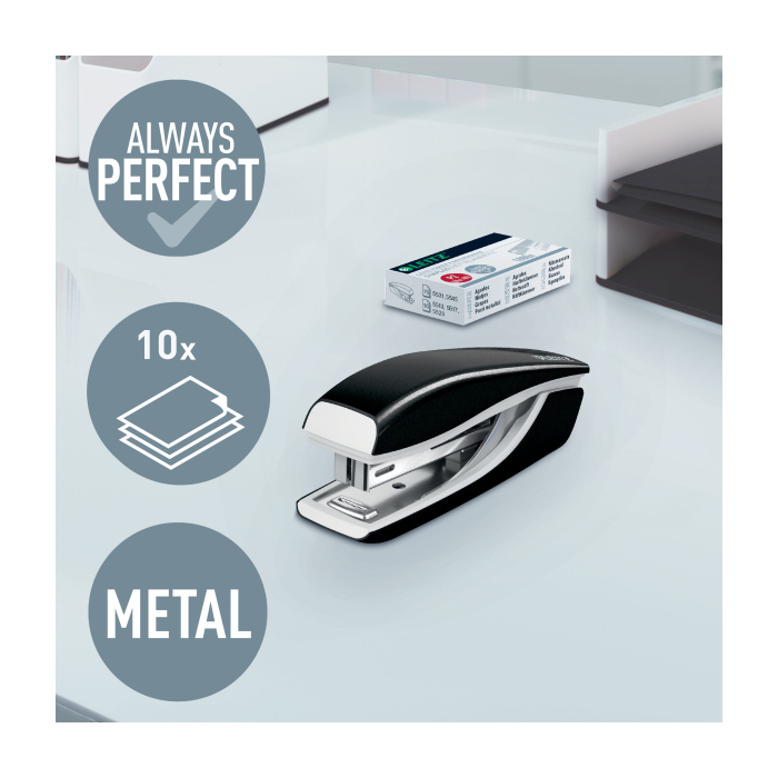 Minisúprava v moderných farbách. Malé a kompaktné rozmery. Kapacita 10 hárkov. Celokovová minizošívačka a dierovačka na použitie v kancelárii aj na cestách. Zošívačka s otvorením ramena o 180° na nástenkové zošívanie. Použite spinky Leitz Power Performance P2, č. 10, jedna škatuľka spiniek je súčasťou balenia. Dierovačka má príložník s kontrastnou potlačou jednotlivých formátov, rámček na jasné určenie formátu. Balenie v blistri. Farba čierna.