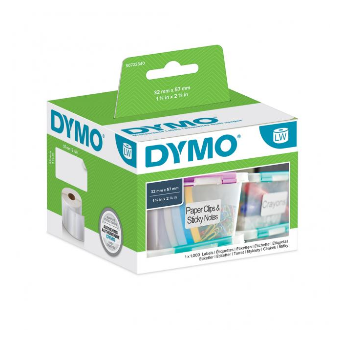 Etikety do tlačiarní Dymo LabelWriter 450 a Labelwriter 450 Duo sú navinuté v rolke. Materiál papier.Farba etikiet biela. Farba: biela Rozmery: 57x32 mm Balenie: 1x1000 ks