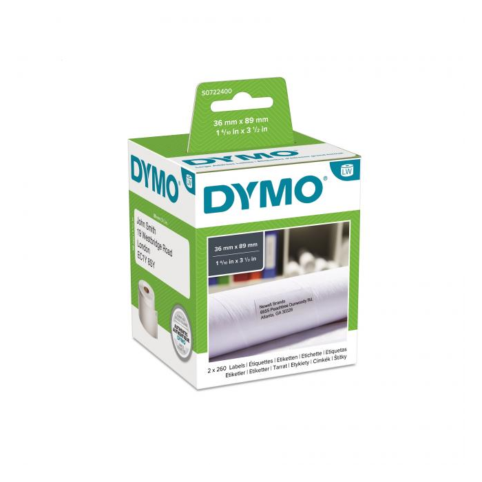 Etikety do tlačiarní Dymo LabelWriter 450 a Labelwriter 450 Duo sú navinuté v rolke. Materiál papier.Farba etikiet biela. Farba: biela Rozmery: 89x36 mm Balenie: 2x260 ks