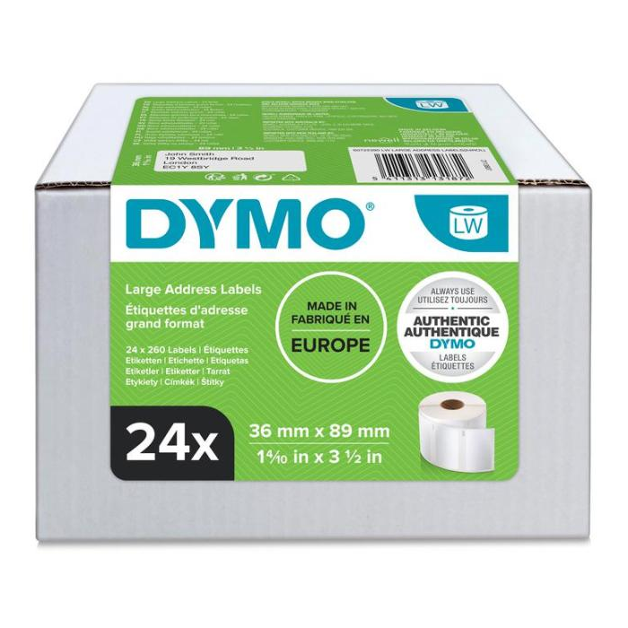 Etikety do tlačiarní Dymo LabelWriter 450 a Labelwriter 450 Duo sú navinuté v rolke. Materiál papier.Farba etikiet biela. Farba: biela Rozmery: 89x36 mm Balenie: 24x260 ks