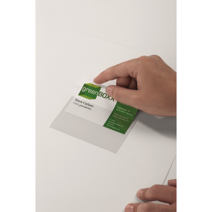 Samolepiace priehľadné vrecká s otvorom zhora na zanechanie kontaktu na propagačných materiáloch, alebo napr. priloženie vizitky k lekárskym záznamom. Kvalitné a trvácne riešenie poskytuje priestor na mnohé kreatívne spôsoby použitia.