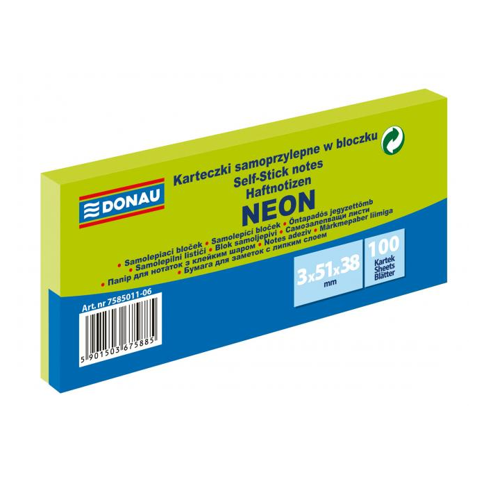 Univerzálne neónové samolepiace bločky z papiera gramáže 70 g / m², 100-lístkové, jednotlivo balené. Lepidlo nanesené po dlhšej strane, zmývateľné vodou. Udelený Green Point. 3 bločky vo fólii s červeným pruhom na uľahčenie otvárania. Väčšie balenie 36 ks. Farba zelená.