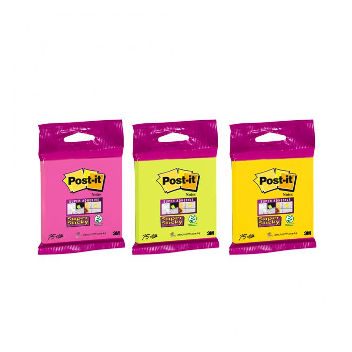 Bločky Post-it Super Sticky, rozmery 76x76mm, balenie 75 lístkov, farby ultra žltá, zelená alebo fuksiová. Dodávaný 1 kus bez možnosti výberu farby.