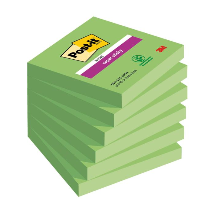 Bločky Post‑it® Super Sticky™ so špeciálnym lepidlom, vďaka ktorému držia aj na nerovnom povrchu. Po odlepení nezanechávajú stopy po lepidle. Farba svetlozelená. Rozmery 76 x76 mm. Počet lístkov 6 x 90.