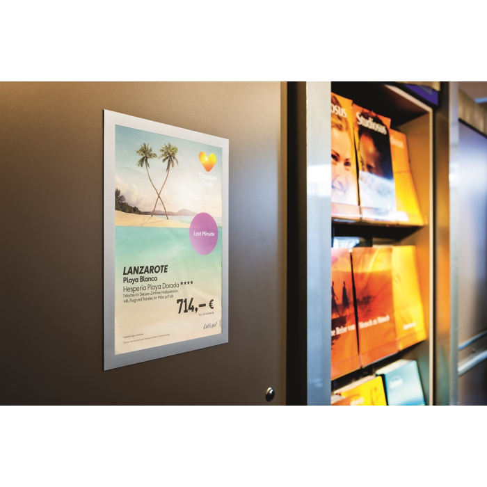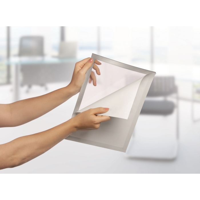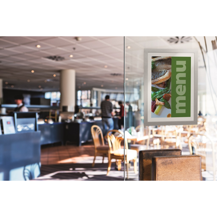 Samolepiaci informačný panel s prednou magnetickou časťou. Ideálny na vystavovanie plagátov, kľúčových informácií, špeciálnych oznamov alebo dôležitých čísel. Informácie sa ľahko vymieňajú a sú čitateľné z oboch strán, ak sa panel umiestni napr. na okno alebo priehľadné dvere. Vhodný na hladké a pevné povrchy. V prípade potreby je ľahko premiestniteľný bez potreby vŕtania. Formát A4, rámik strieborný.