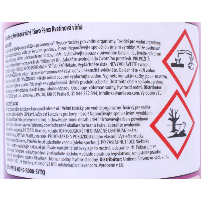 SK: Spôsobuje vážne poleptanie kože a poškodenie očí. Veľmi toxický pre vodné organizmy. Toxický pre vodné organizmy, s dlhodobými účinkami. Môže byť korozívna pre kovy. Pozor! Nepoužívajte spolu s inými výrobkami. Môžu sa uvoľňovať nebezpečné plyny (chlór). Uchovávajte mimo dosahu detí. Uchovávajte iba v pôvodnom balení. Noste ochranné rukavice/ochranný odev/ ochranné okuliare/ ochranu tváre. Zabráňte uvoľneniu do životného prostredia. PO POŽITÍ: Okamžite volajte TOXIKOLOGICKÉ INFORMAČNÉ CENTRUM/ lekára. Vypláchnite ústa. NEVYVOLÁVAJTE zvracanie. PRI KONTAKTE S POKOŽKOU (alebo vlasmi): Vyzlečte všetky kontaminované časti odevu. Pokožku ihneď opláchnite vodou (alebo sprchou). PO ZASIAHNUTÍ OČÍ: Niekoľko minút ich opatrne vyplachujte vodou. Ak používate kontaktné šošovky a je to možné, odstráňte ich. Pokračujte vo vyplachovaní. Zozbierajte uniknutý produkt. Zneškodnite nádobu v súlade a platnou legislatívou, umiestnite prázdnu nádobu do komunálneho odpadu. Obsahuje: chlórnan sodný, hydroxid sodný. Distribútor: Unilever Slovensko, spol. s.r.o., Karadžičova 10, 821 08 Bratislava, tel. č.: 0850 123 850, infolinka@unilever.com. Vyrobené v EU.