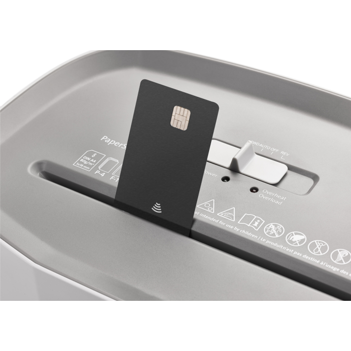 Skartuje : sponky do zošívačky, kreditné karty, kancelárske sponky