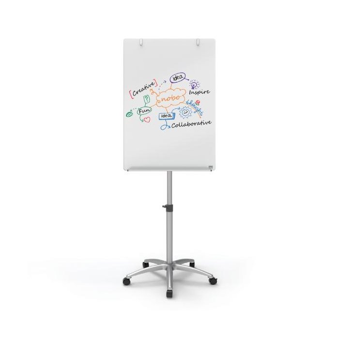 Na sklenený flipchart Nobo sa vojdú všetky vaše nápady! Štýlový moderný dizajn a výškovo nastaviteľná základňa na kolieskach sa hodí do každej zasadacej miestnosti a kancelárie. Obsahuje háčiky na zavesenie flipchart blokov. Magnetický sklenený povrch zaručuje najlepšiu možnú mazateľnosť a je vhodný na každodenné používanie. Rozmery 70 x 100 cm.