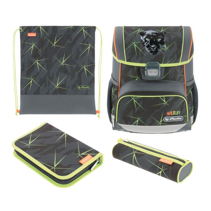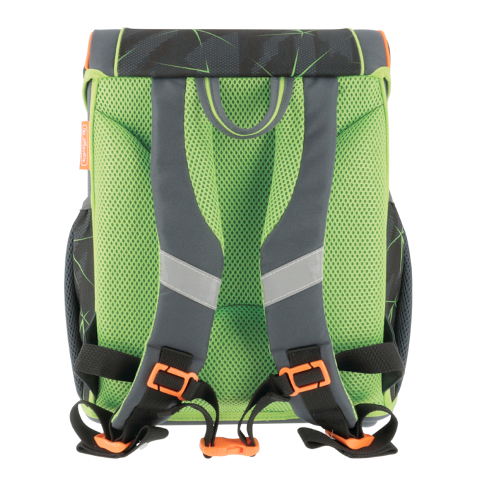 Školská taška s výbavou, ergonomicky tvarovaným a priedušným polstrovaním chrbta, nastaviteľnými ramennými popruhmi, výškovo nastaviteľným hrudným pásom, hlavným vreckom s priestorom na knihy, bočnými vreckami s elastickými pásikmi, predným vreckom na zips, stabilnou spodnou doskou s nožičkami, pohodlnou rukoväťou a reflexnými prvkami Oralite. Hmotnosť 950 g, objem 16 l, rozmery 37 x 31 x 22 cm. Vode-odolná, bez PVC, výbava: peračník, vrecko na prezuvky, okrúhle puzdro. Certifikát ergonómie 2023 a 2025. Materiál: polyester.