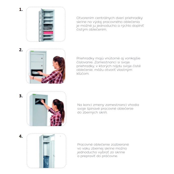 Využitie týchto skriniek sa odporúča v prípadoch, ak sa používa naraz väčšie množstvo pracovného odevu. Pomocou skriniek do práčovne sa výdaj a zber oblečenia stáva jednoduchou a ovládateľnou záležitosťou. Zamestnanec zodpovedný za výdaj a zber pracovného oblečenia používa iba jeden kľúč na obsluhu celého systému. Zatiaľ zamestnanci používajúci konkrétny priestor môžu otvoriť iba svoj vlastný.