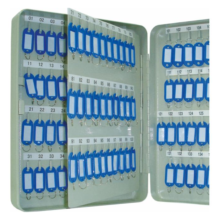 Uzamykateľná skrinka z pevnej ocele na bezpečné uloženie kľúčov. Cylindrický zámok dodávaný s 2 kľúčmi. Zahŕňa rôzne sady vešiakov na kľúče, štítkov a indexového listu. Obsahuje tiež súpravu na upevnenie na stenu. Farba sivá.