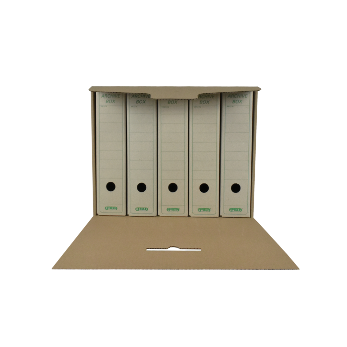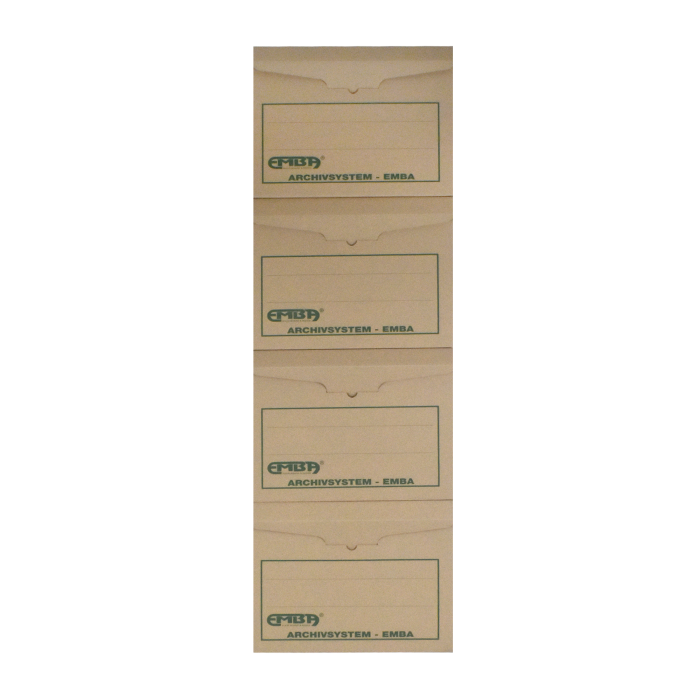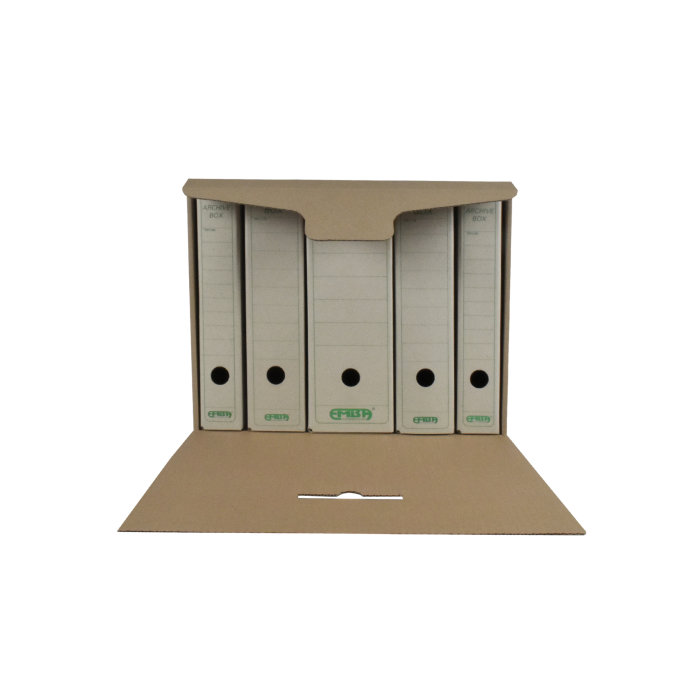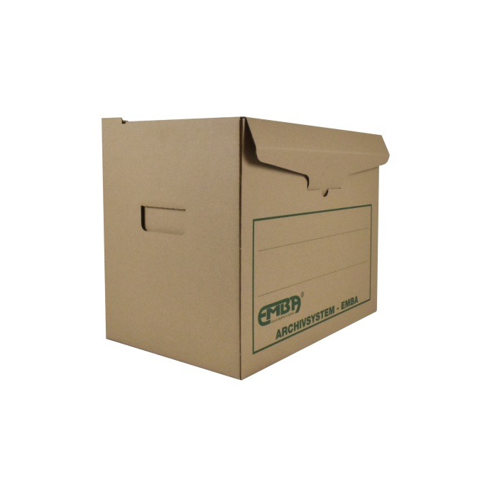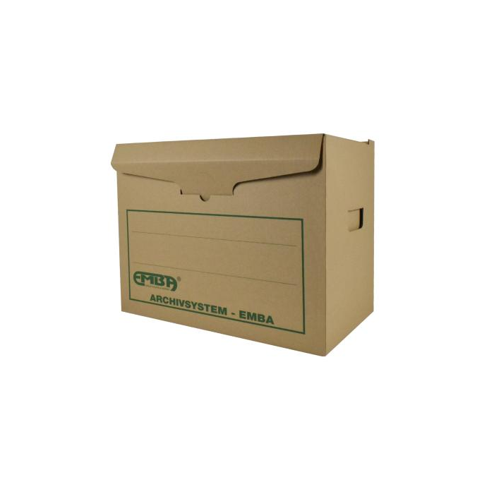 Skupinový box EMBA - uzatvárateľný box s prehľadným popisovaním a zosilnenými stenami s možnosťou ukladania až 4 boxov na seba. Kapacita 5 archívnych boxov EMBA I/-75, resp. kombinácia 2 ks I/-50, 2 ks I/-75 a 1 ks I/-110. Nevhodný na archiváciu zakladačov. Vyrobený z kvalitnej trojvrstvovej vlnitej lepenky H/-H so zelenou potlačou. Dodávaný v rozloženom stave. Farba prírodná hnedá. Rozmery (š x v x d) 400 x 335 x 265 mm.