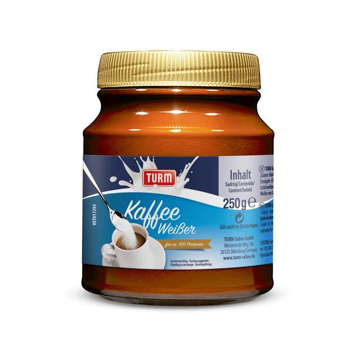 Glukózový sirup, rastlinný olej(kokosový), stabilizátory: E340, E452, MLIEČNA BIELKOVINA, emulgátor: E471, protihrudkujúca látka: E551, farbivo: E160a.