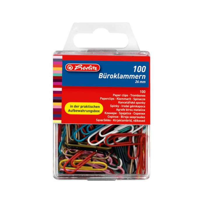 Farebné kancelárske spisové spony. Veľkosť 26 mm. Balenie 100 kusov.