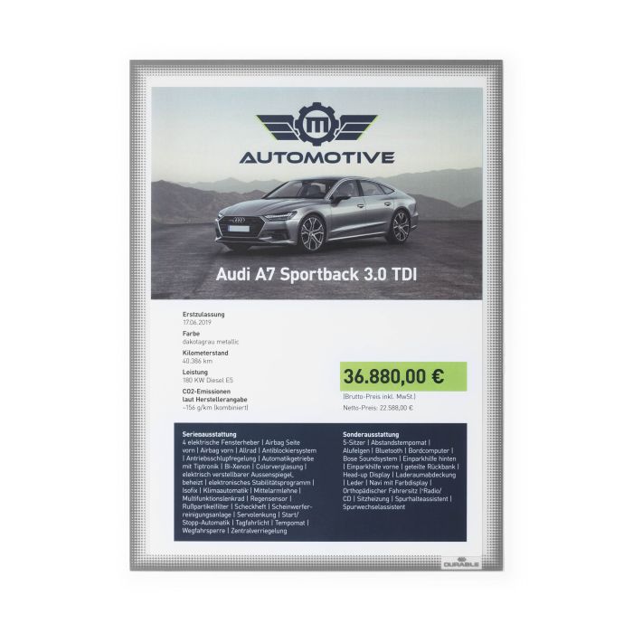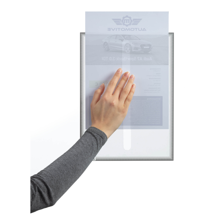 Staticky lepiace informačné vrecká formátu A4 sú vhodné na umiestnenie napr. ponúk na okná automobilov, na výklady, na hladké aj zakrivené sklenené povrchy v interiéroch. Premiestniteľné a opakovateľne použiteľné bez zanechania zvyškov. Sivý rám s bodkovanou potlačou. Možnosť aplikácie na výšku alebo na šírku. Stabilné do cca. 70°C, s UV ochranou. Návod na použitie sa nachádza na zadnej strane obalu. Do vnútra sa vojdú 4 hárky A4. V balení 5 ks vreciek.