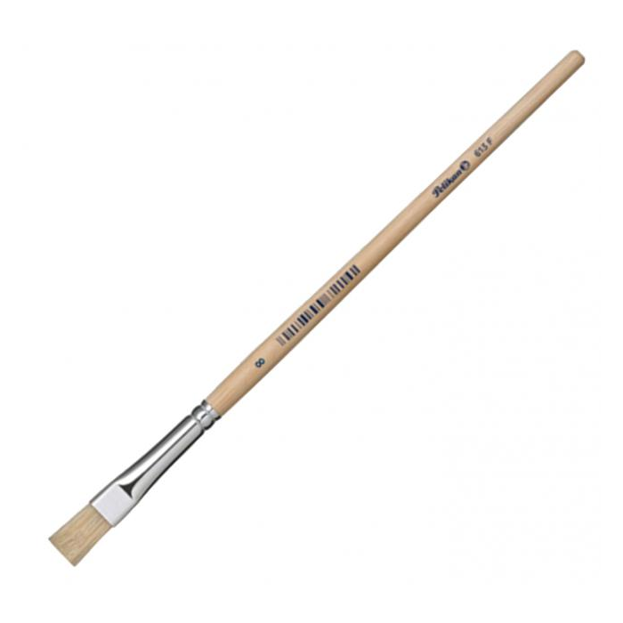 Plochý štetec s krátkymi štetinami. Drevená rukoväť lakovaná bezfarebným lakom a hliníkovým úchytom, s hrúbkou stopy 8 mm. Určený k maľovaniu a kresleniu na papier.
