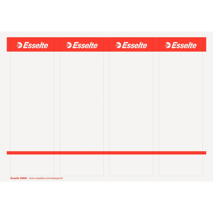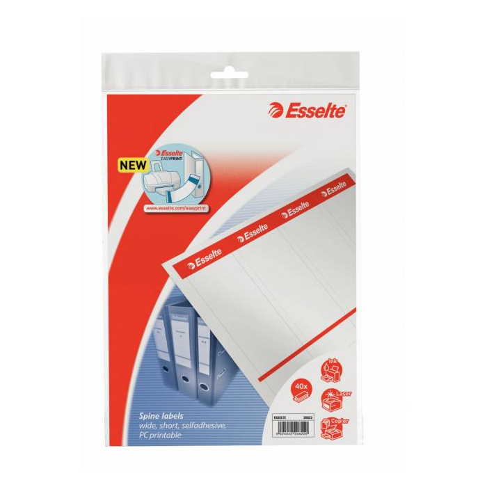 Náhradné samolepiace papierové chrbtové štítky na páíkové kartónové zakladače Rainbow a Mramor, šírky chrbta 7,5 cm na identifikáciu založených dokumentov. Štítky sú vhodné na potlač do laserových a atramentových tlačiarní a kopíriek cez jednoduchý internetový nástroj `EASYPRINT` na stránke www.esselte.com/easyprint. V balení 10 hárkov (á 4 štítky/hárok) s predperforovanými štítkami rozmeru 59 x 192 mm. Hmotnosť papieru 80 g/m2. Farba biela