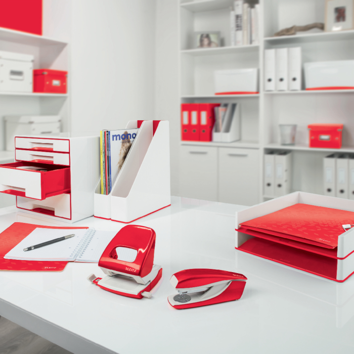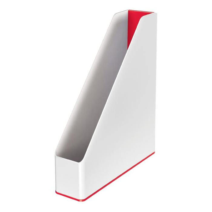 Stojan na bezpečné ukladanie časopisov a katalógov v dvojfarebnom prevedení v metalických farbách WOW s lesklým povrchom. Farba biela/červená.