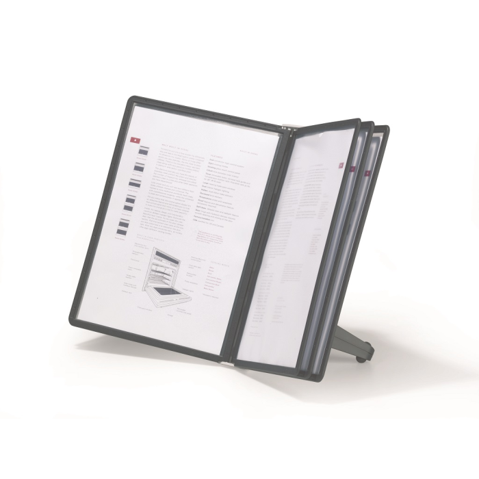 Stojan na stôl s 5 polypropylénovými displejovými panelmi formátu A4 do malých kancelárií. Stabilná základňa, systém ideálny pre užívateľov, ktorí sú obmedzení nedostatkom miesta. Farba základne i panelových rámčekov čierna. Kapacita panelov: 5 Dodávaný: s panelmi Farby panelov: čierna
