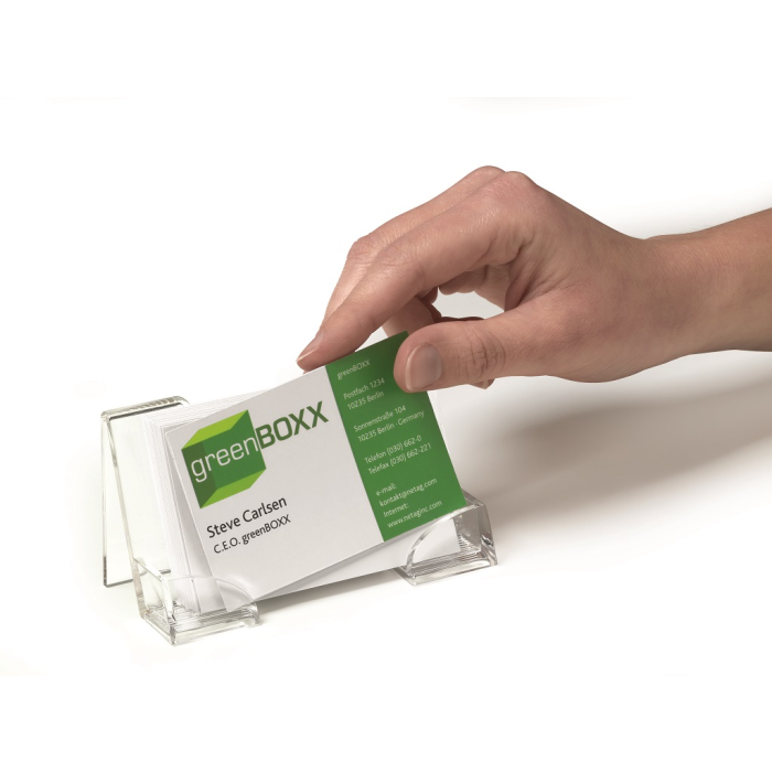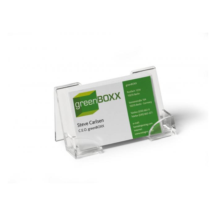 Jednoduchý a zároveň štýlový stolový stojan na vizitky. Dodávaný so samolepiacimi protišmykovými podložkami. Kapacita 50 vizitiek maximálnej šírky 100 mm. Farba číra.