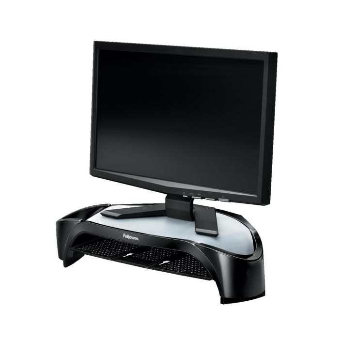 Moderný oblý dizajn stojana pod LCD monitory do 21` s nenáročnou inštaláciou na stôl z produktovej rady Fellowes Smart Suites. Odkladacia polička na papier, dve postranné odkladacie priehradky. Nastaviteľná výška v troch úrovniach. Výška základne: 100-150 mm Nosnosť: 10 kg