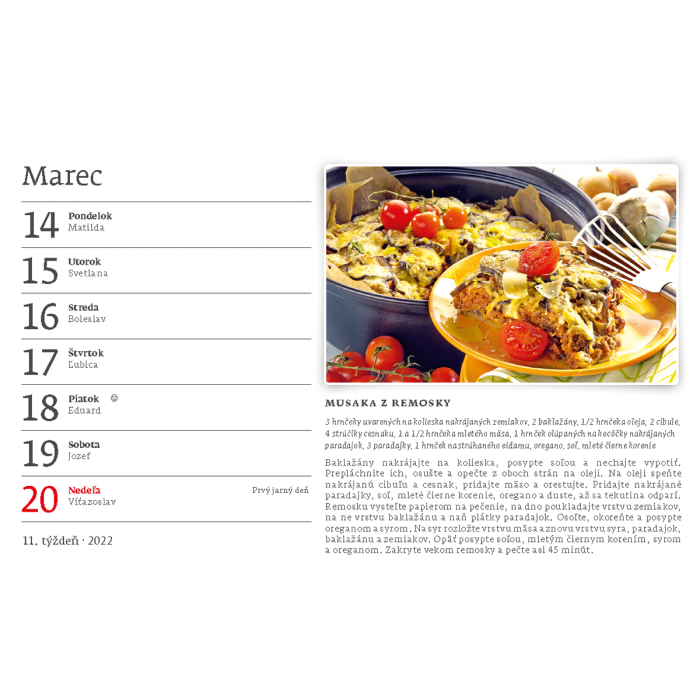 Formát kalendára: 22,6 x 13,9 cm Kalendárium: slovenské týždenné riadkové Počet strán kalendára: 58 + 2 Stojanček: s plným dnom Priestor na potlač: 22,6 x 3 cm