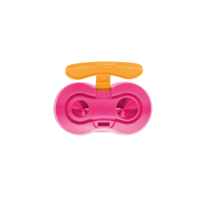 Dvojité plastové strúhadlo Flower, s dózou a dvomi otvormi na klasické a veľké ceruzky, farba modrá a ružová, balenie v displeji.