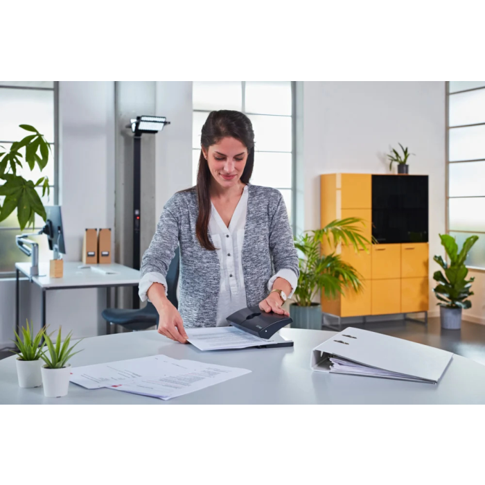 Kancelárska štvordierovačka s posuvným pravítkom a aretáciou v kovovom prevedení. Rozpätie dier 8 cm. Hmotnosť 1200 g. Záruka 10 rokov. Farba: čierna/sivá. Kapacita dierovania 25 listov.