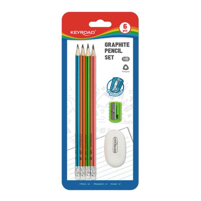 Sada školských pomôcok KEYROAD, 6 ks: drevená ceruzka HB trojuholníková, s gumou 4 ks, plastové strúhadlo 1 ks, guma 1 ks. Balenie: blister. Farba: mix farieb.