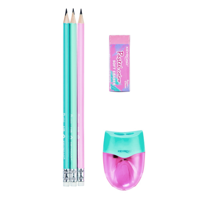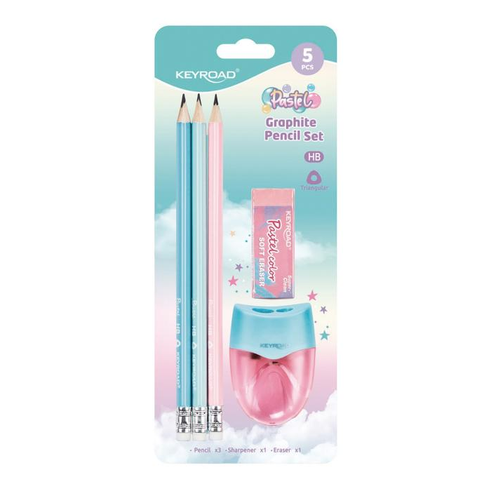 Súprava pastelových grafitových ceruziek KEYROAD, 5 ks: grafitová ceruzka trojuholníková, s gumou 3 ks, strúhadlo plastové dvojité, s nádobkou 1 ks, mäkká guma 1 ks. Balenie: blister. Farba: mix farieb.