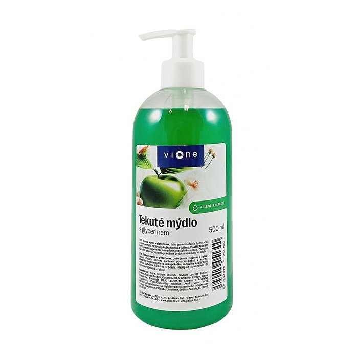 Mydlo bohato pení a spoľahlivo odstráni z rúk a z pokožky špinu a nečistoty. VIONE TEKUTÉ MYDLO s perleťou zelené JABLKO nedráždi Vašu pokožku a zanechá ju jemnú a hebkú.