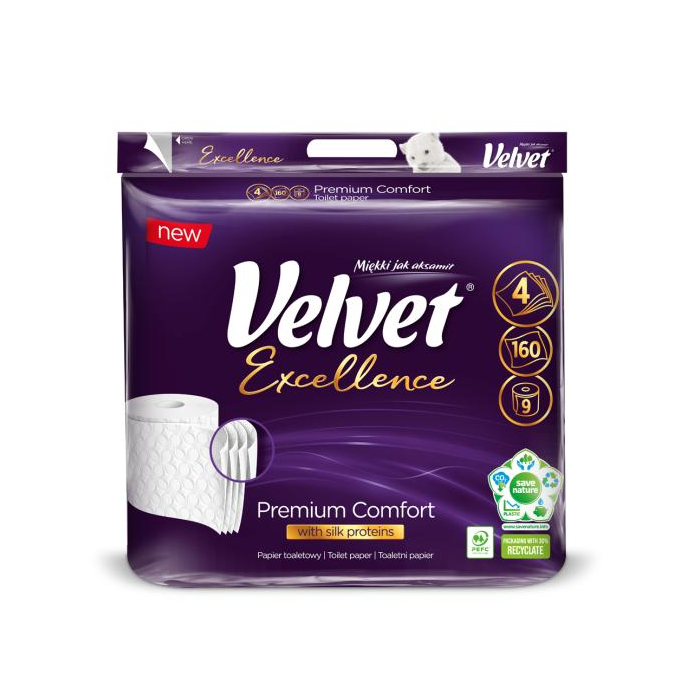 Toaletný papier Velvet Excellence sú veľké, ideálne navinuté rolky pevného papiera, ktorý sa skladá zo štyroch vrstiev mäkkého, jemného papiera. Jeho pevné, silné a snehovo biele útržky, ozdobené estetickým vzorom razby, to nie je len pohodlie a maximálny užívateľský komfort, ale aj jednoduchosť a minimalizmus, vhodné na vybavenie každej toalety. Toaletný papier navyše obsahuje tzv. „hodvábny proteín“, čo je ľahká bielkovina, z ktorej sa skladajú hodvábne nite. Vďaka príbuznosti s bielkovinou ľudskej kože - keratínom - sa hodvábny proteín dobre uchytáva na povrchu pokožky a tvorí tak zvláčňujúcu ochrannú bariéru, ktorá skvele zadržuje vlhkosť a chráni pred vplyvmi vonkajšieho prostredia. 9 roliek, 4 vrstvy, návin 20 m, 100% celulóza